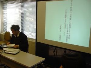 去る2011 年1 月8 日(土)13:00 〜 17:00、法政大学国際日本学研究所セミナー室において、研究アプローチ1第2回研究会が開催された。今回は、前年にアルザス・シンポジウムで講演をおこなったその内容を軸に、日本国号の起源、および近代の政治思想のありようを、国内の研究者に投げかける発表であった。なお本アプローチでは、国際日本学インスティテュートの博士後期課程学生で国際日本学研究所学術研究員である者や、博士号取得者で研究所客員学術研究員である者に、積極的に研究に参加してもらう方針をとっている。今回はその中の二人より、近代思想、近代文学からの問題提起をしてもらった。報告の概要は以下の通りである。