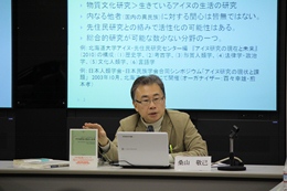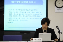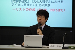 11月18日(金)は、熊本県立大学文学部の大島明秀准教授に「戦後熊本における郷土史編纂活動─「郷土文化研究所」を中心に」というテーマでご報告頂いた。昭和23年に熊本県で設立された郷土文化研究所についての、非常に興味深い報告であった。当時の熊本では、いくつかの大学が設立され、県知事、国会議員、マスメディアをはじめとする政財界と学界の名士が80名も結集して「熊本人とは何か」を問う学術機関を創る運動を展開していた。これは幅広い企画で、阿蘇、天草、球磨郡などの広い地域の現地調査、また考古学から近世史にわかる幅広い時代を研究の対象とした。近代史は取り上げられていないのはその特色である。この研究所は熊本女子大学を中心に置かれたが、後に熊本県立大学が設立された際には、大学の組織としては設置されなかった。また、この研究所の中心的な人物であった圭室諦成が明治大学に移籍し熊本を去った後は、活動が後退し、この研究所の活動は3年間で終わった。しかし、この研究所の活動は、学生の勉学のレベルでは長く影響を与えた。討論では、熊本の郷土研究とは対照的に、鹿児島では高校の教員を中心とした数々の小さな研究会が今でも活動を続けていることと、熊本の郷土研究は博物館設立にはつながらなかったことなどが指摘された。 11月19日(土)は、北海道大学大学院文学研究科の桑山敬己教授が「日本のアイヌ研究に関する若干の考察」、北海道大学アイヌ・先住民研究センターの山崎幸治准教授が「『民族学研究』におけるアイヌ研究—終戦から昭和四〇年代まで—」というテーマで、それぞれ膨大な資料を巧みに整理し分析し、戦後のアイヌ研究、特に昭和30年代の問題をとりあげた。昭和24年から数年間にわたって行われた、日本民族学協会の沙流谷アイヌ総合調査が中心的な話題となった。これらの調査が、岡正雄を通じて諸外国、特にウィーン大学におけるアレクサンダー・スラビック教授のアイヌ研究にどのような影響を及ぼしたのかが検討された。