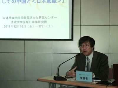 研究協力関係にある法政大学国際日本学研究所(HIJAS)と大連民族学院国際言語文化研究センターとが共催する第二回の合同シンポジウムが,2010年の法政大学での第一回目に続いて,2011年12月に大連民族学院で2日間にわたって開催された。現在HIJASが研究の中心テーマとしている「<日本意識>の再検討」にもつながるものとして,今回は「参照枠としての中国と<日本意識>」が全体テーマとして掲げられた。日本人また中国人が日本を日本として意識する際に,中国を参照枠として用いて‘中国と比べて日本は’といった仕方でそれを行うことが,古代から繰り返されてきたのである。それの諸事例が,法政側7名,大連側6名,合計13名の発表者たちから,時代と領域とをさまざまに横切って紹介されていった。