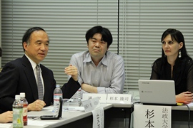 去る2012年4月12日(木)、18時35分から21時15分にかけて、法政大学国際日本学研究所セミナー室において、法政大学国際日本学研究所(HIJAS)の「国際日本学の方法に基づく<日本意識>の再検討—<日本意識>の過去・現在・未来」プロジェクト・アプローチ(3)「<日本意識>の現在—東アジアから」の2012年度第1回東アジア文化研究会が開催された。東アジア文化研究会は、2006年の発足以来、60回を超える研究会を開催している。今回は、西洋研究者の視点を取り入れ、HIJASのプロジェクト・アプローチ(4)「国際日本学の方法に基づく<日本意識>の再検討—<日本意識>の過去・現在・未来」との共催による研究会を行った。