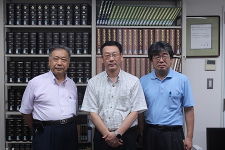 龍谷大学教授三谷真澄氏、東海大学教授片山章雄氏が2015年8月7日、本研究所を表敬訪問され、小口雅史所長、貝塚一郎課長らと懇談した。