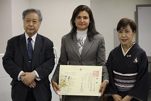 小口雅史HIJAS所長の総合司会で行われた授賞式では、ガブラコヴァ氏に対し、田中優子法政大学総長より正賞の賞状と副賞が授与された。また、尾川浩一学術支援本部担当常務理事が祝辞を述べるとともに、小口所長がヨーゼフ・クライナー博士の祝辞を代読し、ガブラコヴァ氏の功績を称えた。