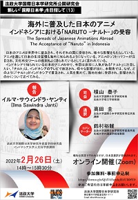 そうした企画の第十三弾として、本研究所客員学術研究員(インドネシア大学人文科学部講師)イルマ・サウィンドラ・ヤンティ氏による公開研究会『海外に普及した日本のアニメ-インドネシアにおける「NARUTO-ナルト-」の受容-』をオンライン開催いたします。ご関心をお持ちの方は、ぜひご参加下さい。