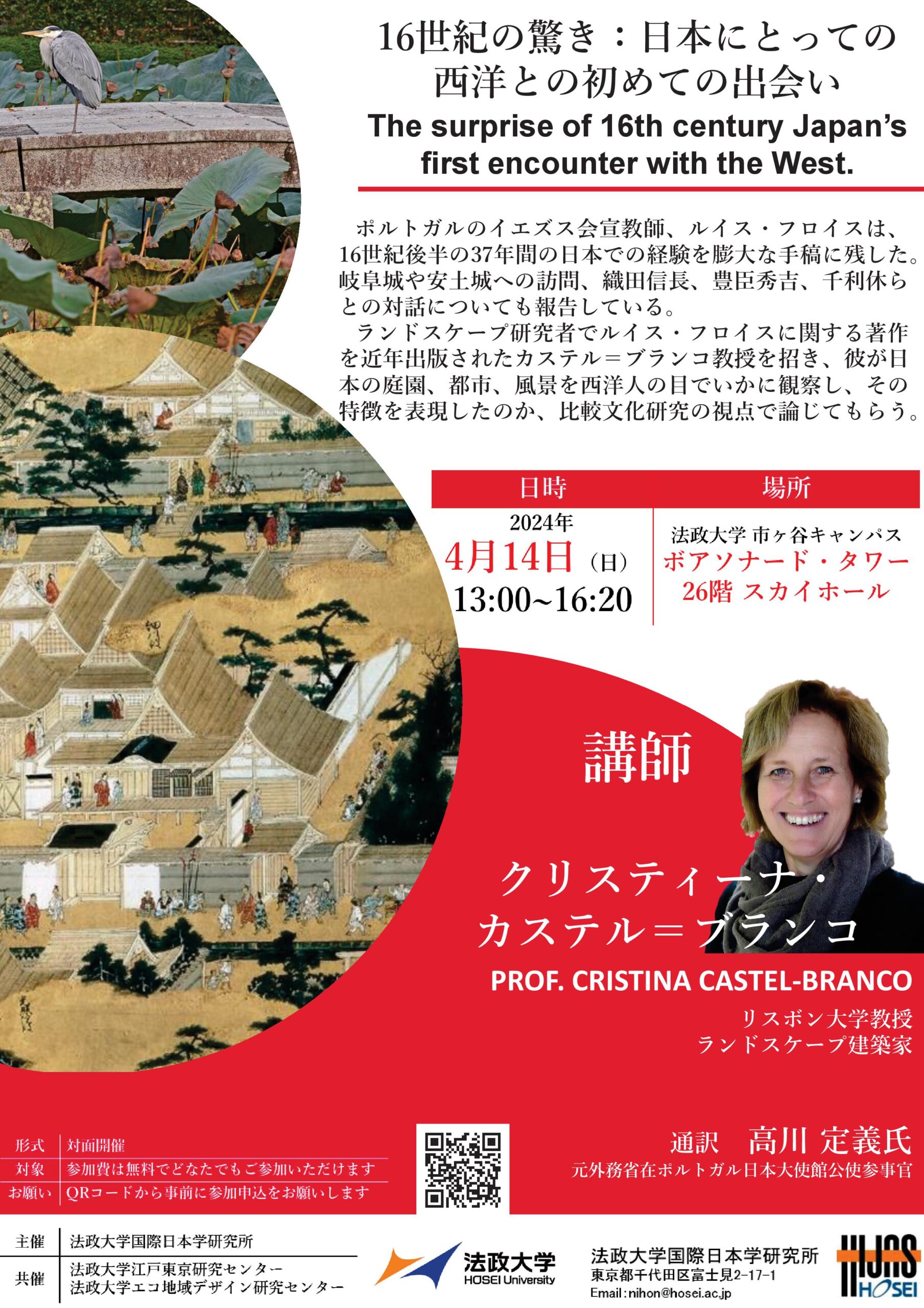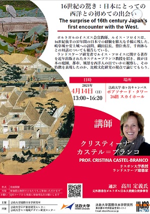 【開催案内】法政大学国際日本学研究所主催・法政大学江戸東京研究センター・法政大学エコ地域デザイン研究センター共催 : クリスティーナ・カステル=ブランコ教授講演会 『16世紀の驚き:日本にとっての西洋との初めての出会い』(2024年4月14日(日))2024/03/15