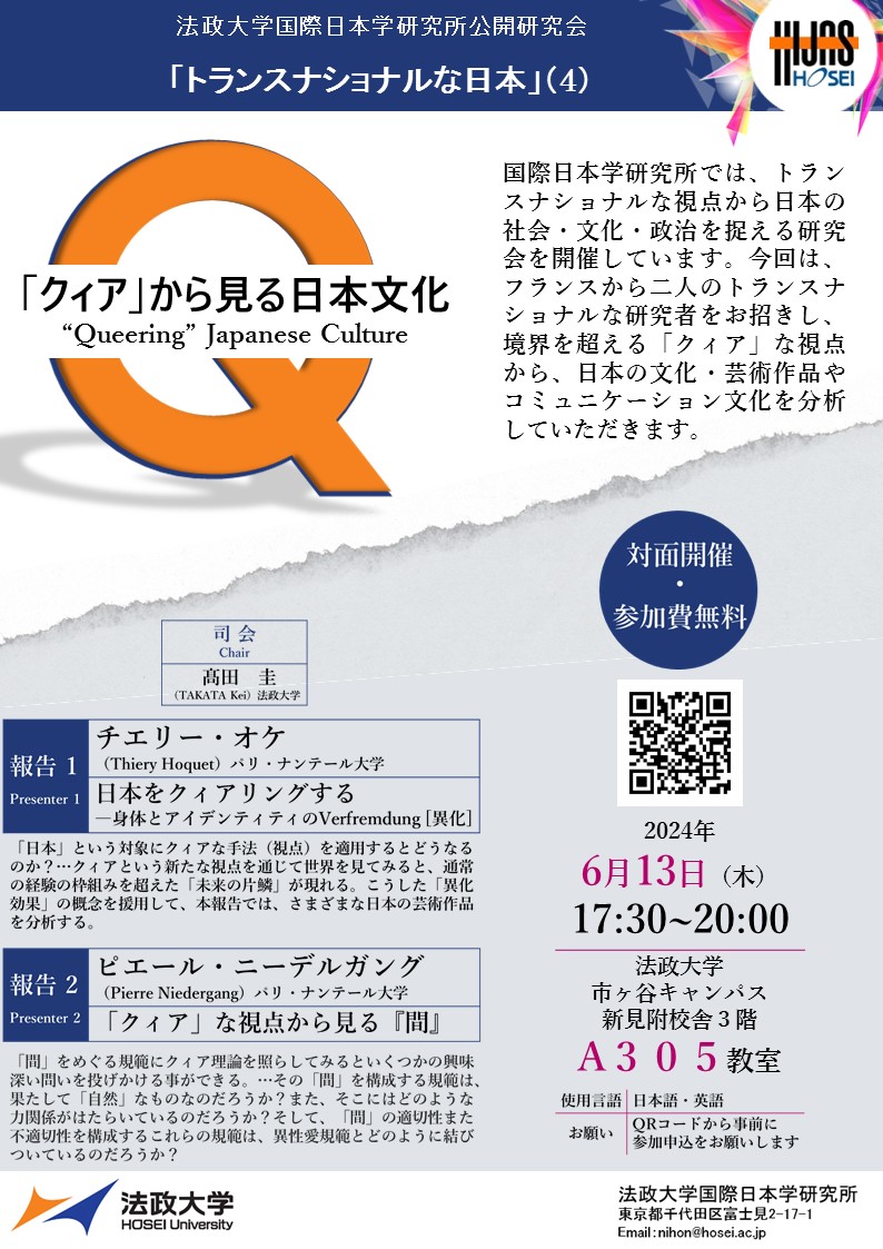 【開催案内】法政大学国際日本学研究所主催 「トランスナショナルな日本」研究会 (4) 「クィア」から見る日本文化 “Queering” Japanese Culture 2024年6月13日(木)2024/05/17