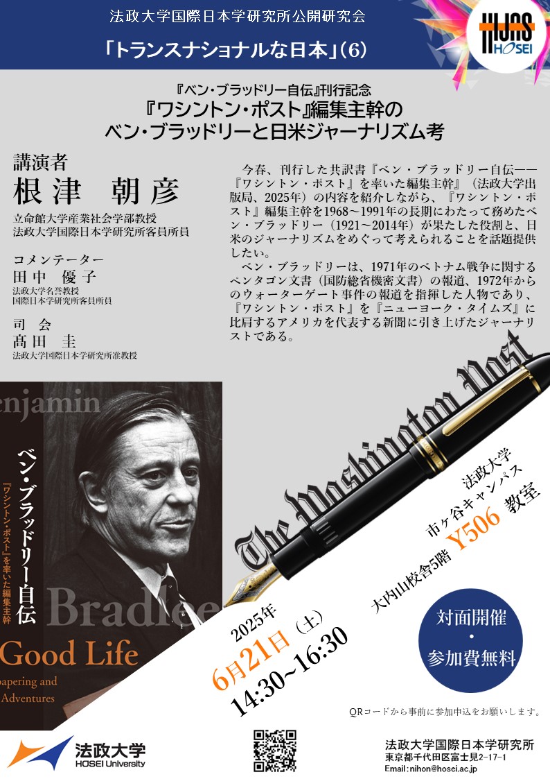 【開催案内】「トランスナショナルな日本」研究会(6) 『ベン・ブラッドリー自伝』刊行記念 「『ワシントン・ポスト』編集主幹のベン・ブラッドリーと日米ジャーナリズム考」(2025年6月21日(土))2025/05/16